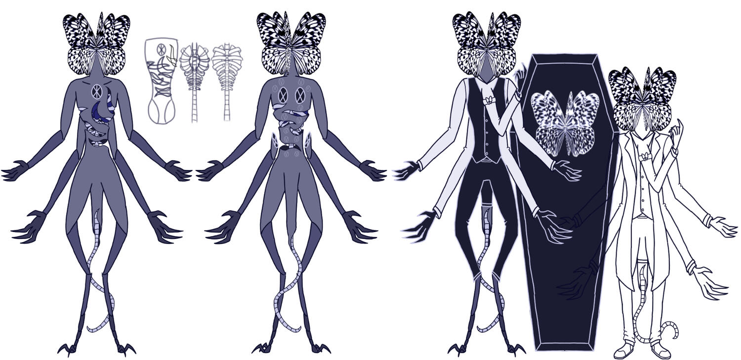 OUTDATED AND NEEDS REWRITING, YEAH I'M FINALLY DOING IT... EVENTUALLYFuneral is a Disposa, an organic creature created by the Entia of Death. He spent his first many years under the guidance of Memoriam, the butterfly Disposa that carried out the purpose of organizing memorial services before me. When Memoriam retired and Funeral took on his task, Memoriam's title, "of the Dead Butterflies," was passed on to him.After the first hundred years Funeral grew bored of living in the Outer Realms, and left to do his job elsewhere, as Entia do not often die.wip